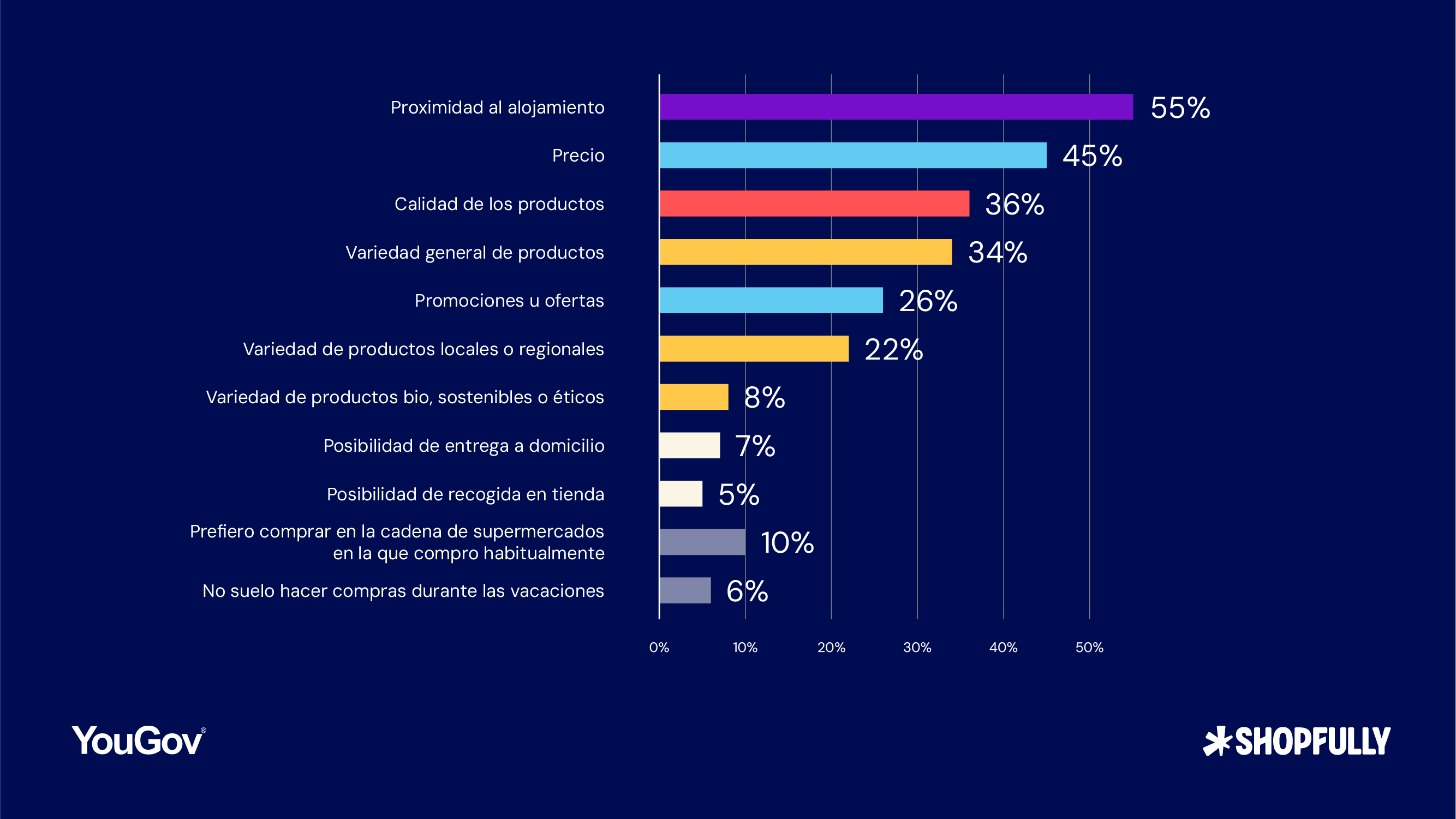 A la hora de hacer la compra durante las vacaciones, la cercanía al alojamiento se impone como el factor más importante para elegir supermercado o tienda de alimentación, mencionada por un 55% de los encuestados. Le siguen el factor económico con 53% (precio + promociones) y la variedad (47%).