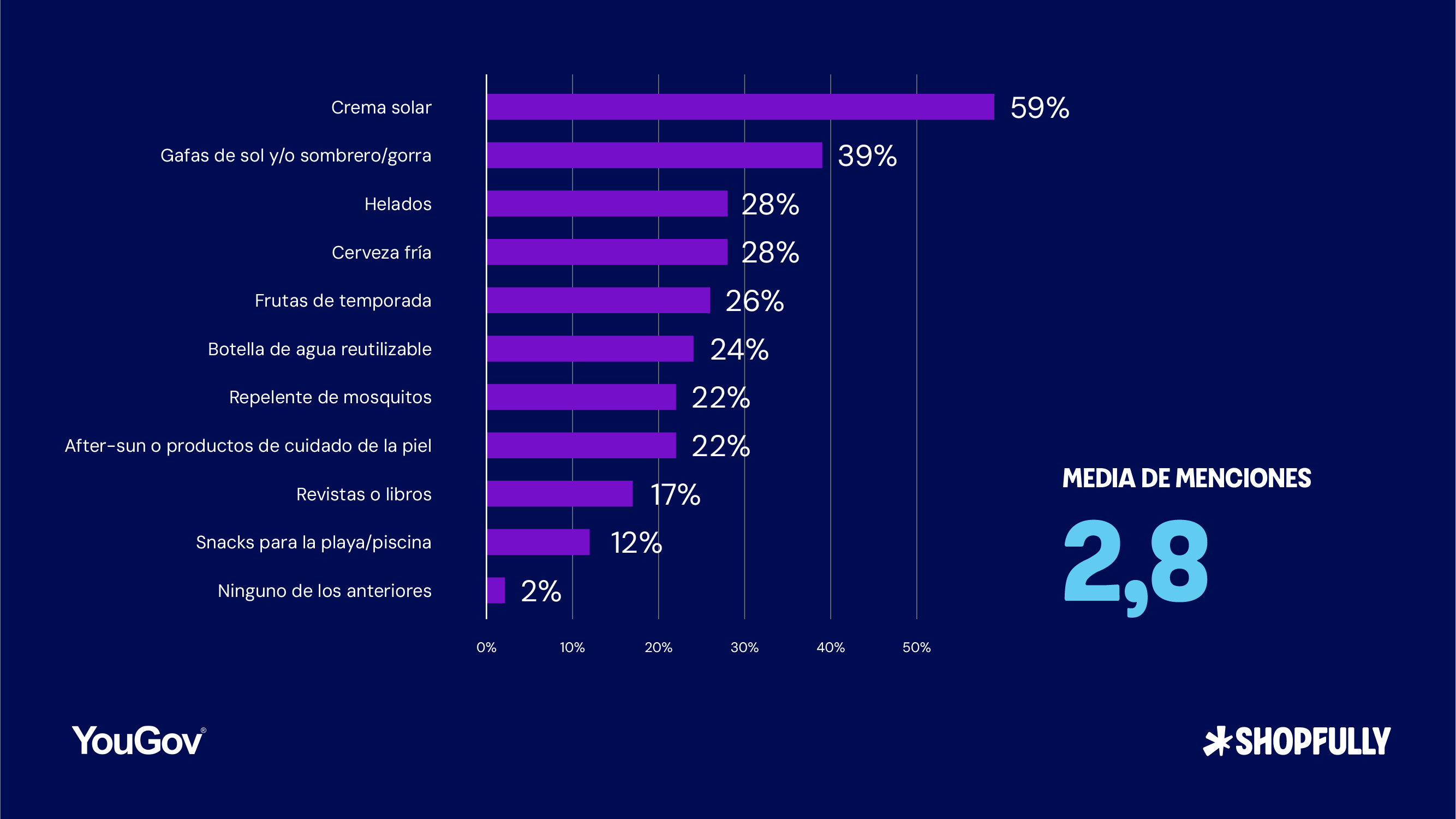 La maleta estival de los españoles revela lo que realmente importa bajo el sol. La crema solar es el artículo imprescindible por excelencia, con un 59% de menciones, seguida de las gafas de sol o gorra (39%), y productos como los helados y la cerveza fría, ambos con un 28%. Las mujeres se decantan más por los productos de cuidado personal, mientras que los hombres prefieren refrescarse con una buena bebida.