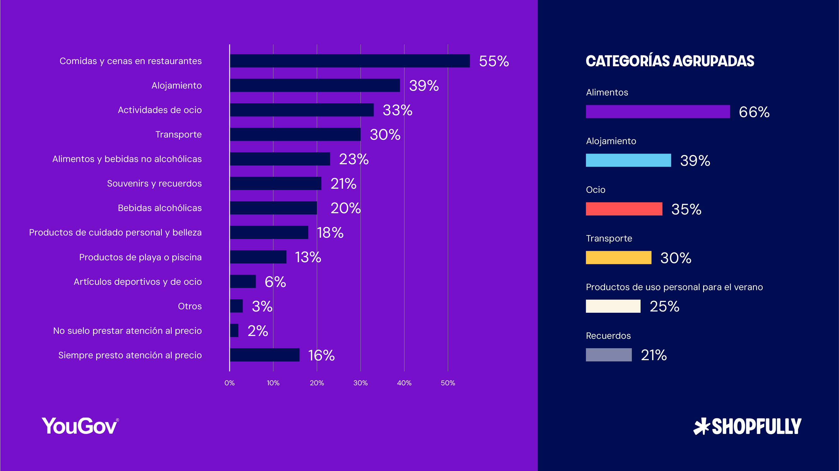 Durante las vacaciones, los hábitos de consumo cambian y se suavizan. Más de la mitad de los encuestados admite que relaja el control sobre el gasto y se permite ciertos caprichos. Encabezan la lista las comidas y cenas fuera de casa (55%), seguidas del alojamiento (39%) y las actividades de ocio como conciertos, visitas o deportes (33%). Este comportamiento más permisivo es especialmente común entre los jóvenes y los hogares con mayor poder adquisitivo. No obstante, un 16% de los españoles mantiene su disciplina financiera incluso en vacaciones y asegura que siempre presta atención al precio.