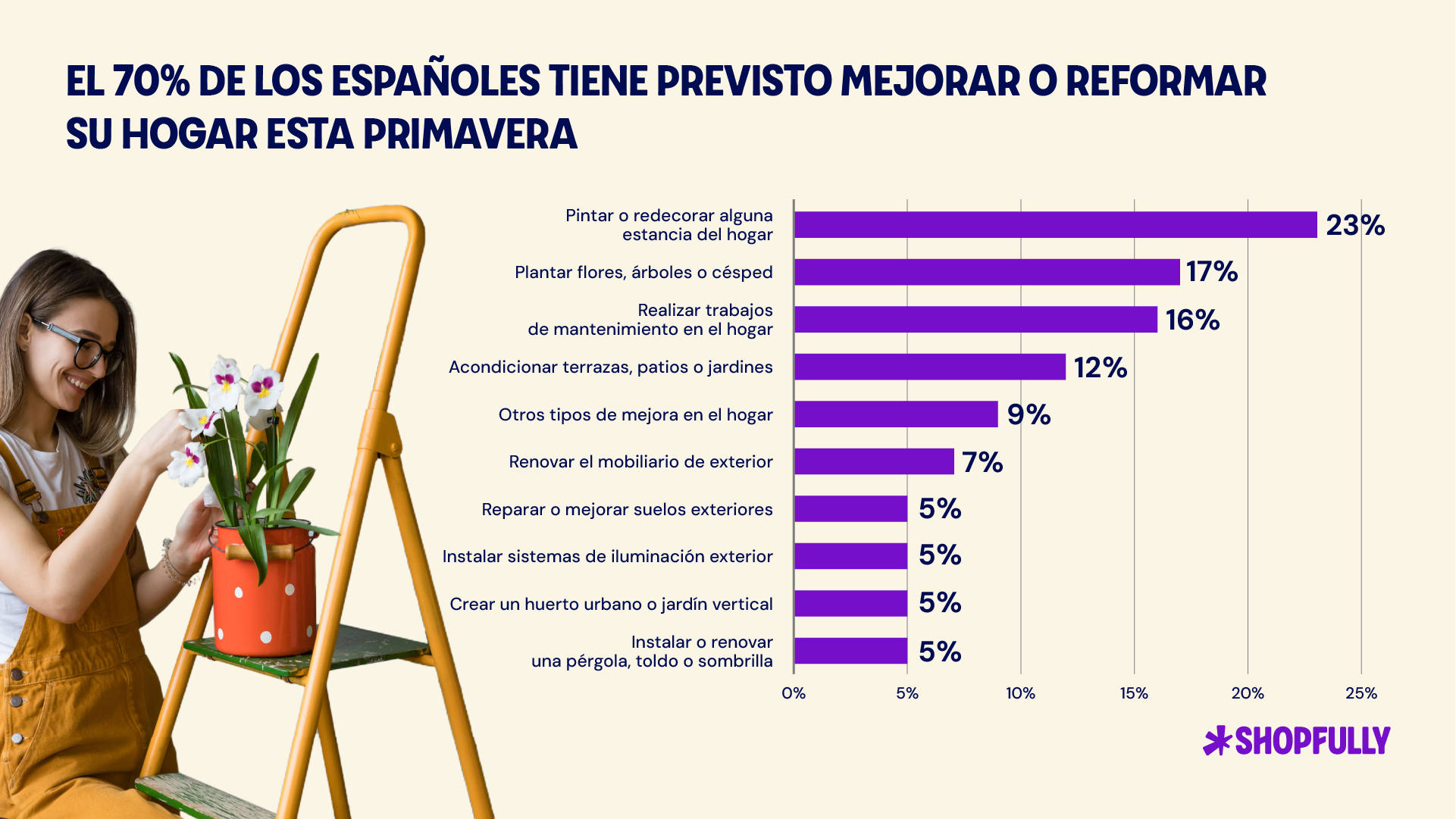 Barcelona, 29 de abril de 2025 – Esta primavera, España se pone manos a la obra. Según un estudio realizado por Shopfully, líder europeo en Drive to Store, en colaboración con YouGov, el 70% de los españoles tiene previsto mejorar o reformar su hogar durante esta temporada. Ya sea renovando una habitación, dando una nueva vida a la terraza o animándose con la jardinería, el espíritu “manitas” se instala con fuerza en los hogares del país.