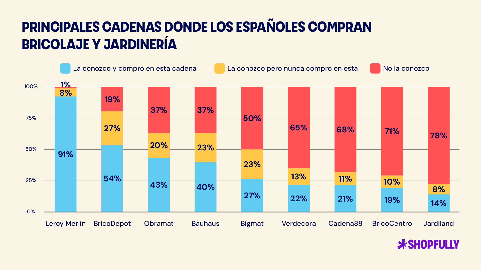 A la hora de comprar productos de bricolaje y jardinería, Leroy Merlín lidera con claridad, con un 91% de consumidores que han comprado algún producto en una de sus tiendas. Le siguen BricoDepot (54%) y Obramat (43%), consolidándose como los tres referentes de la categoría.