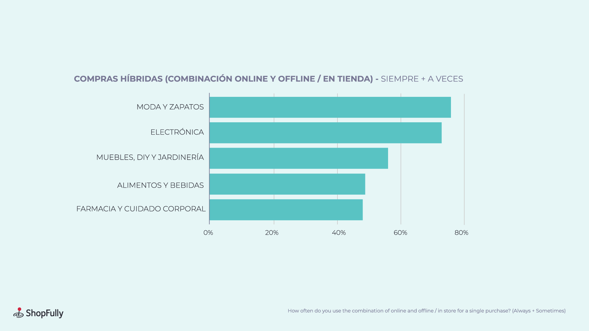 El estudio también destaca el crecimiento de las compras híbridas, en las que se combina el canal online con el canal físico. La moda (76%) y la electrónica (72%) lideran esta tendencia, mientras que los jóvenes de entre 15 y 29 años optan cada vez más por compras híbridas en productos como alimentos básicos (59%) y artículos de farmacia y cuidado personal (61%).