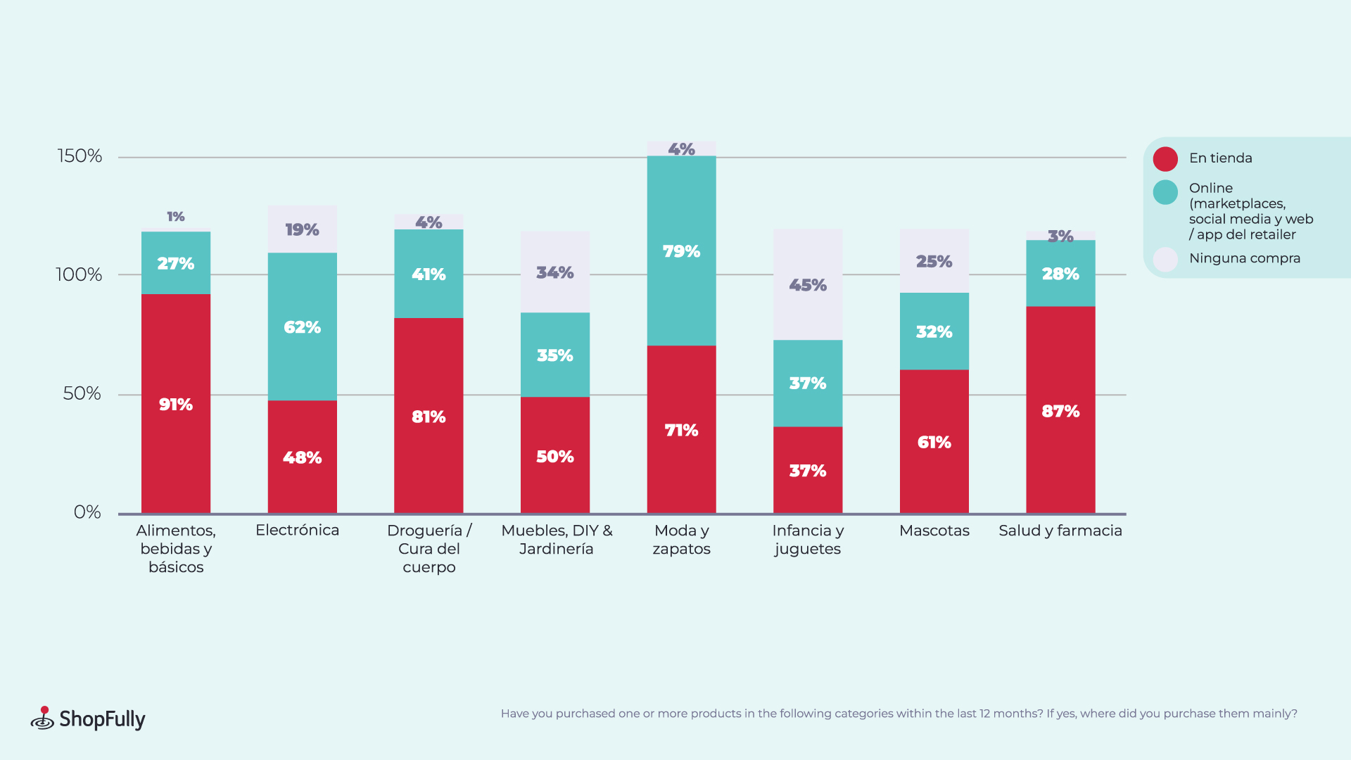 El 66% de las compras en España todavía se realizan en tiendas físicas, confirmando que este sigue siendo el canal preferido, sobre todo para productos como alimentos (91%) y artículos de farmacia y salud (81%). Sin embargo, el canal digital está ganando terreno, especialmente en categorías como electrónica y moda.